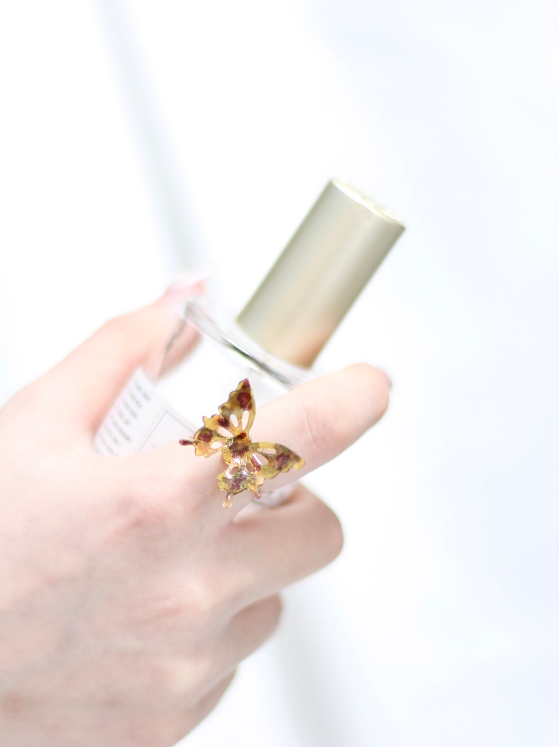 蜂蜜色の琥珀に閉じ込められたかのような、蝶モチーフのリング。